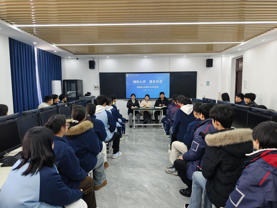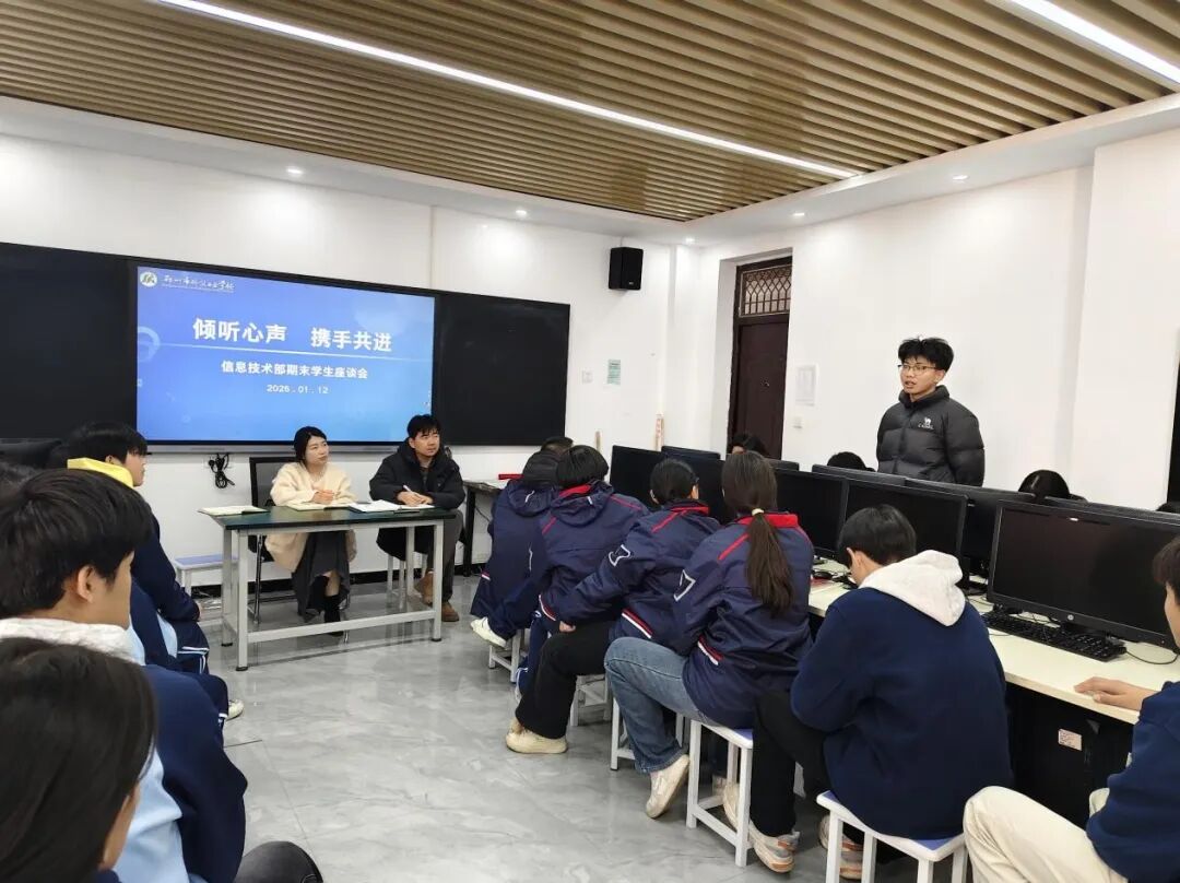 为全面精准掌握学生在学习和校园生活等方面的需求与建议,优化育人服务质量,扎实推进期末学生思想动态研判、校园安全保障、家校共育深化等核心工作,确保学期末各项工作规范、有序、高效落地,2026年1月12日中午,信息技术部召开期末学生座谈会暨班主任工作会议。会议由信息技术部主任李蕾主持,德育主任杨琳芳、教学主任位越越及相关学生代表、全体班主任参与会议。